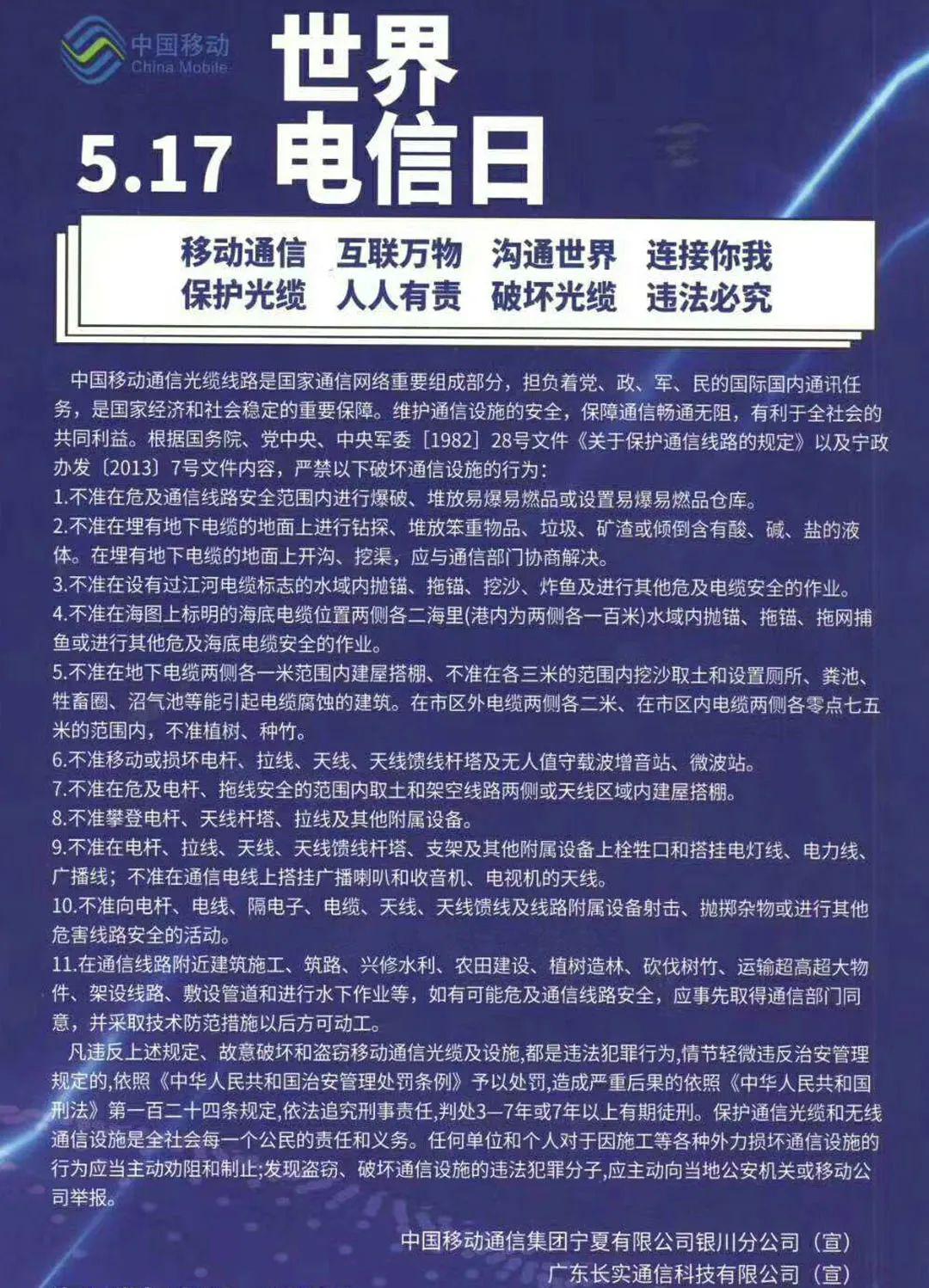 本次宣传活动开云kaiyun(中国)宁夏分公司全员参与,在保障场所发宣传单的同时,大家还通过其他的方式进行了宣传,所住小区有移动宽带覆盖的同事向物业处提交了保护家庭宽带通信设施的告知函和宣传单,留了自己的联系方式,如小区内有开挖等计划将会第一时间告知。大家还通过发微信朋友圈的形式呼吁全民保护通信光缆和无线通信设施。